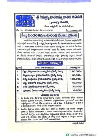 శ్రీ సమ్మక్క సారలమ్మ జాతర అగ్రంపాడు 2026 జాతర సందర్భంగా వివిధ రకాల వేలం పాటలు తేదీ 6 11 2025 గురువారం రోజున ఉదయం 11 గంటలకు సహాయ కమిషనర్ కార్యాలయం వరంగల్ నందు నిర్వహించబడుతుందని జాతర కార్యనిర్వాహణ అధికారి అద్దంకి నాగేశ్వరరావు ఒక ప్రకటనలో తెలిపారు. వేలం పాటలు పారదర్శకంగా నిర్వహించబడతాయని ఆసక్తి గల వ్యక్తులు సమయానికి వేలంలో పాల్గొనాలని అన్నారు.