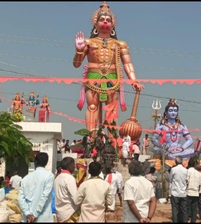 జోగులాంబ గద్వాల జిల్లాలోని ఉండవెల్లి మండలం లోని శ్రీ జోగులంబ రైల్వే హల్ట్ సమీపంలో 36అడుగుల అభయ ఆంజనేయ స్వామి విగ్రహ ప్రతిష్ఠ కార్యక్రమంను వేదపండితులు ఆధ్వర్యంలో శనివారం నిర్వహించారు. గత మూడు రోజులుగా విశిష్ట పూజలు నిర్వహించిన వేదపండితులు పంచముఖ ఆంజనేయ స్వామి రాతి విగ్రహంసీతారాములు విగ్రహాలు ధ్యాన ముద్రలో శివుడు విగ్రహలను ప్రతిష్టించారు. కార్తీక మాసం అలంపూర్ ఆలయాలకు వెళ్లే భక్తులు ఆంజనేయ స్వామి విగ్రహ ప్రతిష్ఠ కార్యక్రమంలో పాల్గొని స్వామి వారిని దర్శించుకున్నారు. దీంతో భక్తులతో సందండి నెలకొన్నది. రోడ్డుపై ట్రాఫిక్ సమస్యలు లేకుండా ఎస్సై శేఖర్ తన సిబ్బంది తో కలిసి బందోబస్తు నిర్వహించారు. అధిక సంఖ్యలో తరలి వచ్చిన భక్తులు అన్నదానం కార్యక్రమంలో పాల్గొన్నారు.
