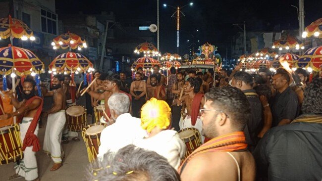 యాదాద్రి భువనగిరి జిల్లా భూదాన్ పోచంపల్లి పట్టణ పురవీధులలో శ్రీ అయ్య ప్ప స్వామి ఊరేగింపు గురువారం రాత్రి వైభవో పేతంగా నిర్వహింపబడింది. స్వా మివారి బ్రహ్మోత్సవాల సందర్భంగా ఆలయ కమిటీ -అయ్యప్ప భక్త సమాజం ఆ ధ్వర్యంలో ఈ ఊరేగింపు కార్యక్రమం నిర్వహింపబడింది. ప్రత్యేకంగా అలంకరిం పబడిన వాహనంపై అయ్యప్ప స్వామివిగ్రహంతో పాటు విగ్నేశ్వర స్వామి, జగ న్మాత విగ్రహాలను అదిష్టింప చేశారు. స్వామివారి ఆలయం నుండి ఊరేగింపు ప్రారంభమైంది. ఊరేగింపు ముందు కేరళ వాయిద్య బృందం వాయిద్యాలు మ్రోగి స్తుండగా, భారీ ఎత్తున బాణసంచా పేల్చుతూ, స్వామి మాలధారణ చేసిన భక్తు లు స్వామి భక్తి పాటలతో నృత్యాలు చేస్తుండగా ,విద్యుత్ దీపాల గొడుగులతో ఫోకస్ లైట్ల వెలుతురులో స్వామివారి ఊరేగింపు పట్టణ పురవీధుల గుండా కొన సాగుతూ గాంధీ విగ్రహం వరకు నిర్వహింపబడింది. మాల ధరించిన భక్తులు స్వా మి భక్తి పాటలతో నృత్యాలు చేస్తూ ఆనంద పారవశంతో తన్మయత్వం పొందారు. వీరి నృత్యాలు భక్తజనులను ఆకట్టుకున్నాయి.ప్రధాన కూడలిలో వీరిపై మెరుపు కాగితం ముక్కలు ,పువ్వుల జల్లు కురిపించారు. కన్నుల పండుగగా స్వామివారి ఊరేగింపు మహోత్సవం బ్రహ్మోత్సవాల చివరి రోజు అయిన గురువారం రాత్రి మహా వైభోపీతంగా నిర్వహించబడింది. ఈ కార్యక్రమంలో ఆలయ కమిటీ వారు, గురుస్వాములు, స్వామి మాల ధరించిన భక్తులు భారీ సంఖ్యలో పాల్గొన్నారు. పట్టణ వీధులు దద్ద రిల్లాయి, అయ్యప్ప స్వామి నామం మారు మ్రోగింది. శబరి వాతావరణం నెలకొంది. రోడ్డుకి ఇరువైపులా ప్రజలు నిల్చోని స్వామివారిని దర్శిం చుకున్నారు. స్వామియే శరణమయ్యప్ప అంటూ భక్తులు పెద్ద పెట్టున నినదిం చారు.