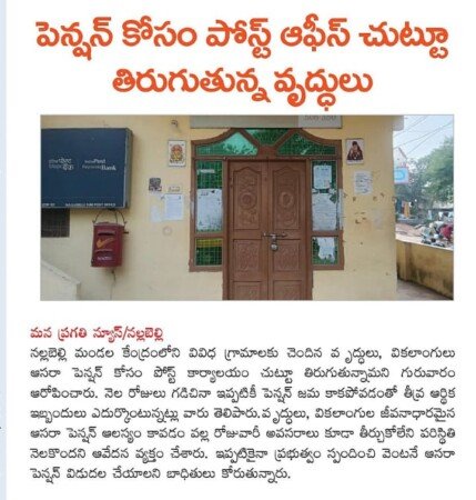 మన ప్రగతి పత్రికలో గురువారం ప్రచురితమైన..’ పెన్షన్ కోసం ఆఫీస్ చుట్టూ తిరుగుతున్న వృద్దులు` అనే కథనానికి శుక్రవారం పోస్ట్ ఆఫీస్ అధికారులు స్పందించారు. పింఛన్ దారులకు శుక్రవారం విధిగా పెన్షన్ అందించారు. ఈ శీర్షికను ప్రచురించిన మన ప్రగతి దినపత్రిక కు పెన్షన్ దారులు కృతజ్ఞతలు తెలిపారు.