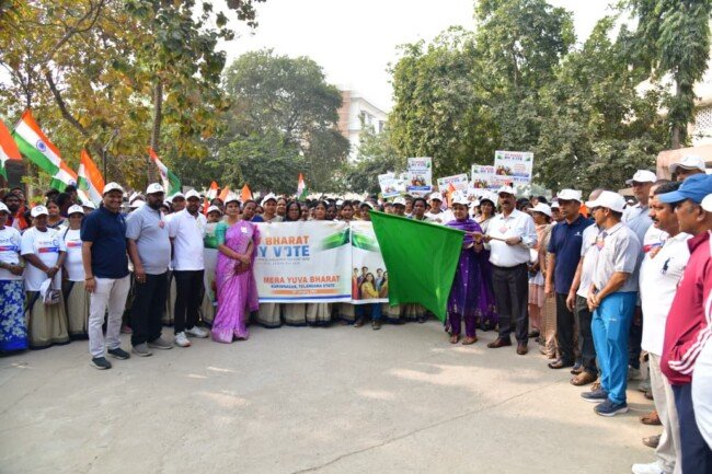 జాతీయ ఓటర్ దినోత్సవ సందర్భంగా జిల్లా కేంద్రంలోని అంబేద్కర్ స్టేడియం నుంచి భగత్ సింగ్ చౌరస్తా మీదుగా కలెక్టరేట్ వరకు ర్యాలీ నిర్వహించారు.అడిషనల్ కలెక్టర్ లక్ష్మీ కిరణ్ ఈ ర్యాలీని ప్రారంభించారు.ఓటును మించి ఏది లేదు- నేను కచ్చితంగా ఓటు వేస్తాను అనే నినాదంతో ర్యాలీ తీశారు.కరీంనగర్ క్రీడా పాఠశాల విద్యార్థులు,స్కౌట్,గైడ్స్ విద్యార్థులు,కలెక్టరేట్,రెవెన్యూ సిబ్బంది ఇతర శాఖల సిబ్బంది ర్యాలీలో పాల్గొన్నారు.ఈ కార్యక్రమంలో రెవెన్యూ డివిజనల్ అధికారి మహేశ్వర్,జిల్లా క్రీడా శాఖ అధికారి శ్రీనివాస్ గౌడ్,బీసీ సంక్షేమ అధికారి అనిల్ ప్రకాష్,డీవైఎస్ఓ శ్రీనివాస్, జిల్లా యువజన అధికారి రాంబాబు తదితరులు పాల్గొన్నారు.
